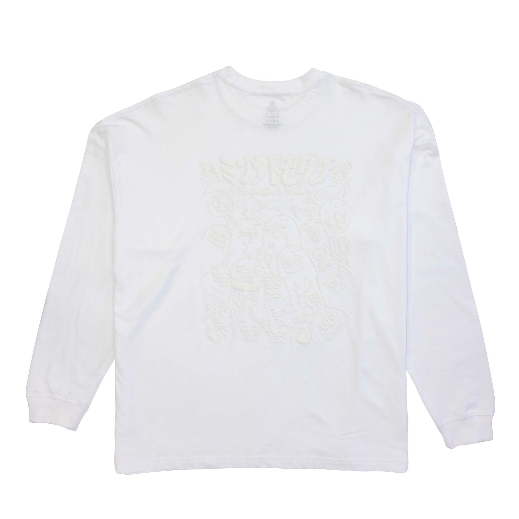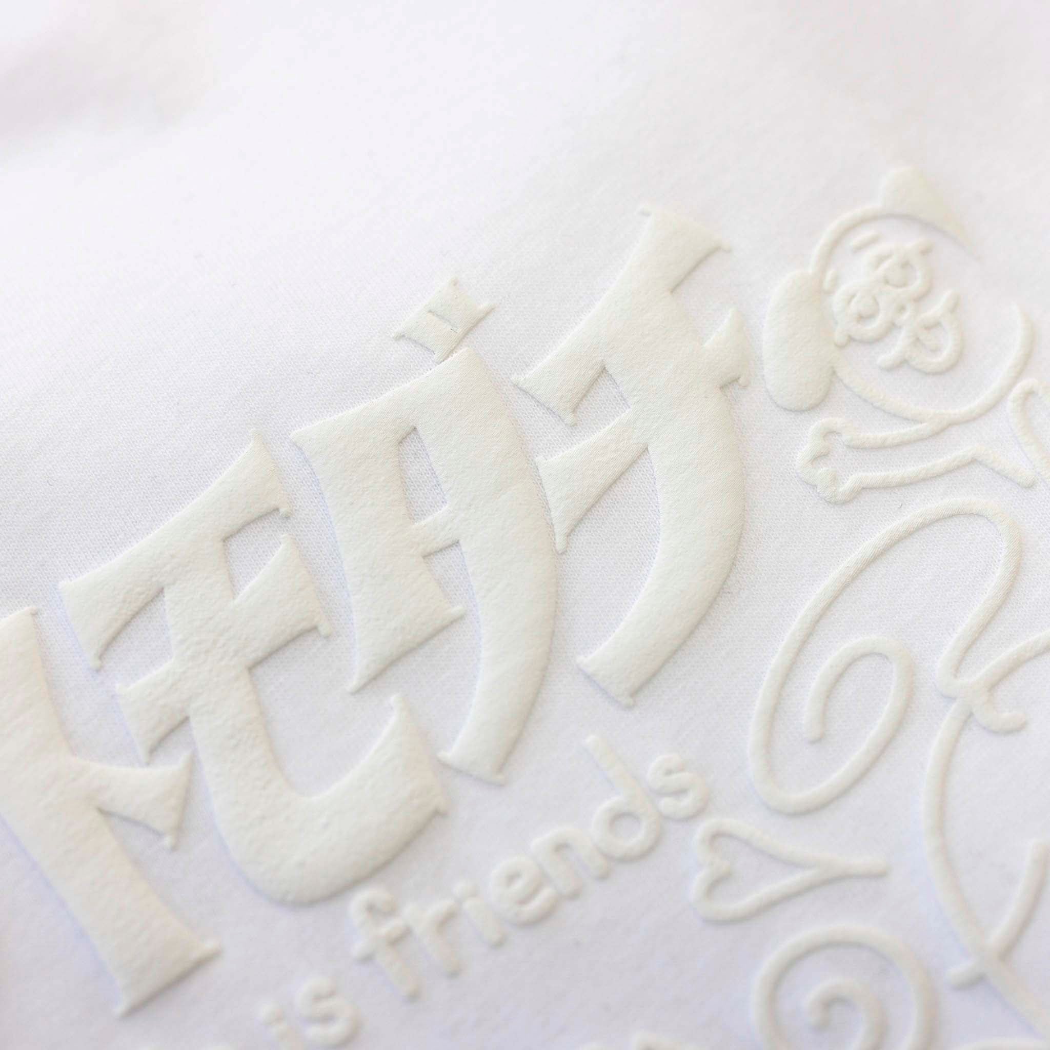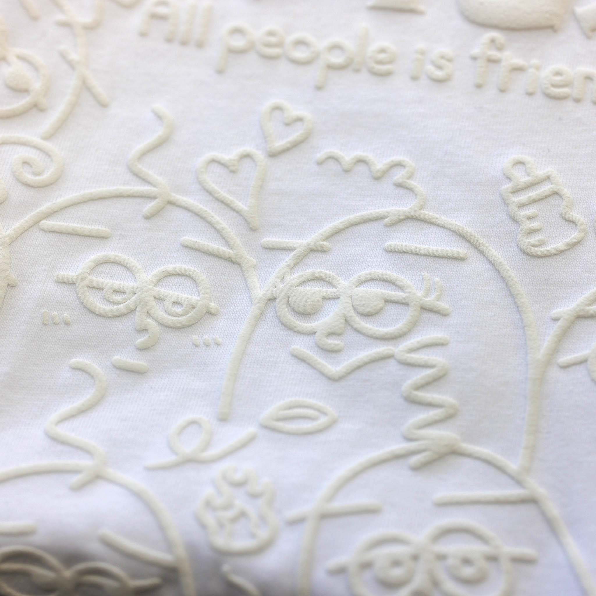 ミンナトモダチ。その気持ちがパッと目に見えなくても、触れ合えばわかる。服と同系色のインクで加工しているためパッと見デザインが見えにくいですが、発泡インクのため触れるとふわふわもこもこしてます。目だけでなく、沢山の感覚から想いが伝わるように。ホワイト/ブラックが通常カラー。フロストグレー/アシッドブルー/スモーキーパープルは少数限定。ビッグシルエットの為、女性はMサイズがオススメです! 購入希望の方はお早めに