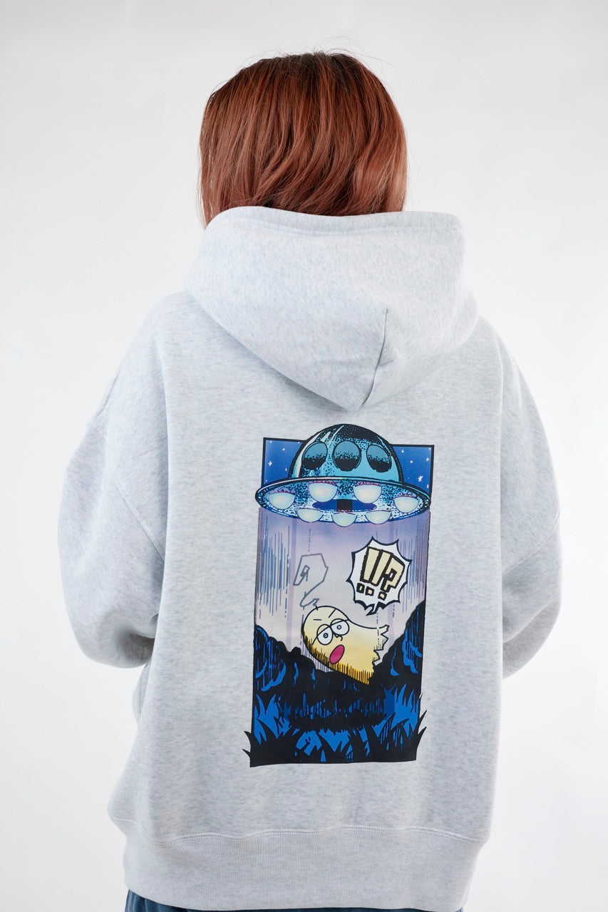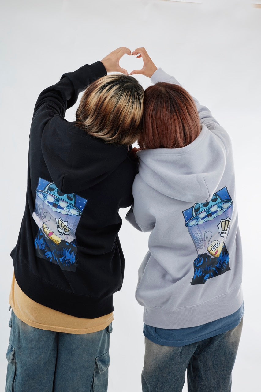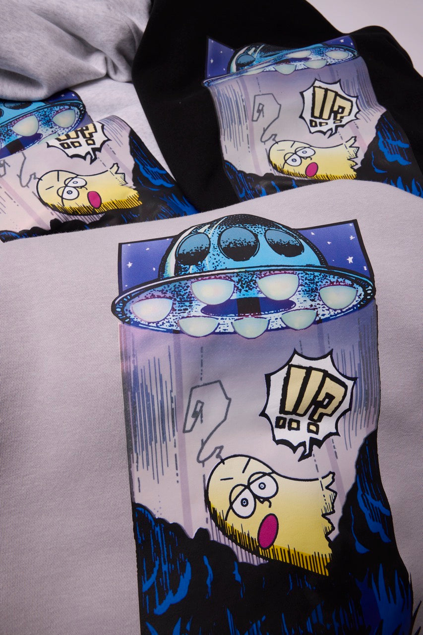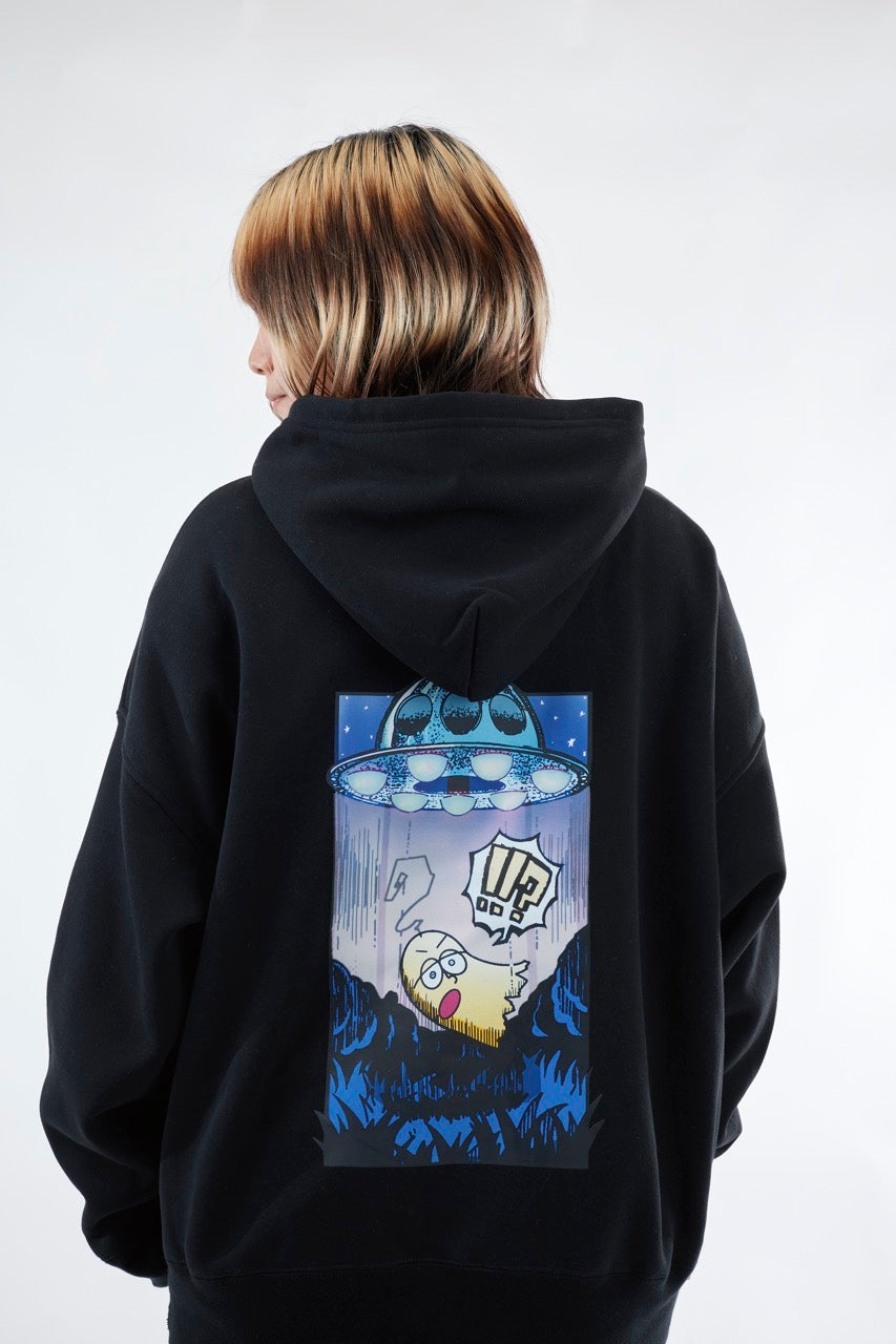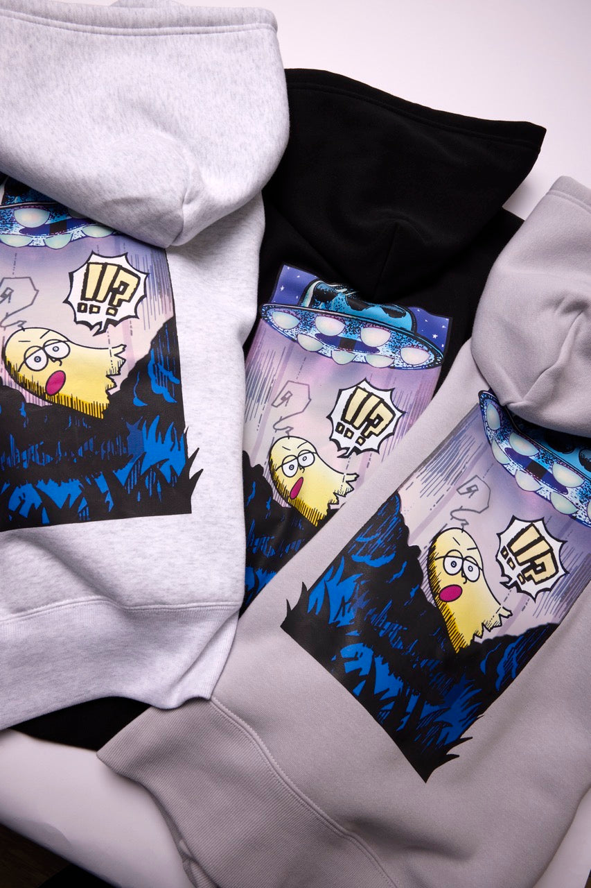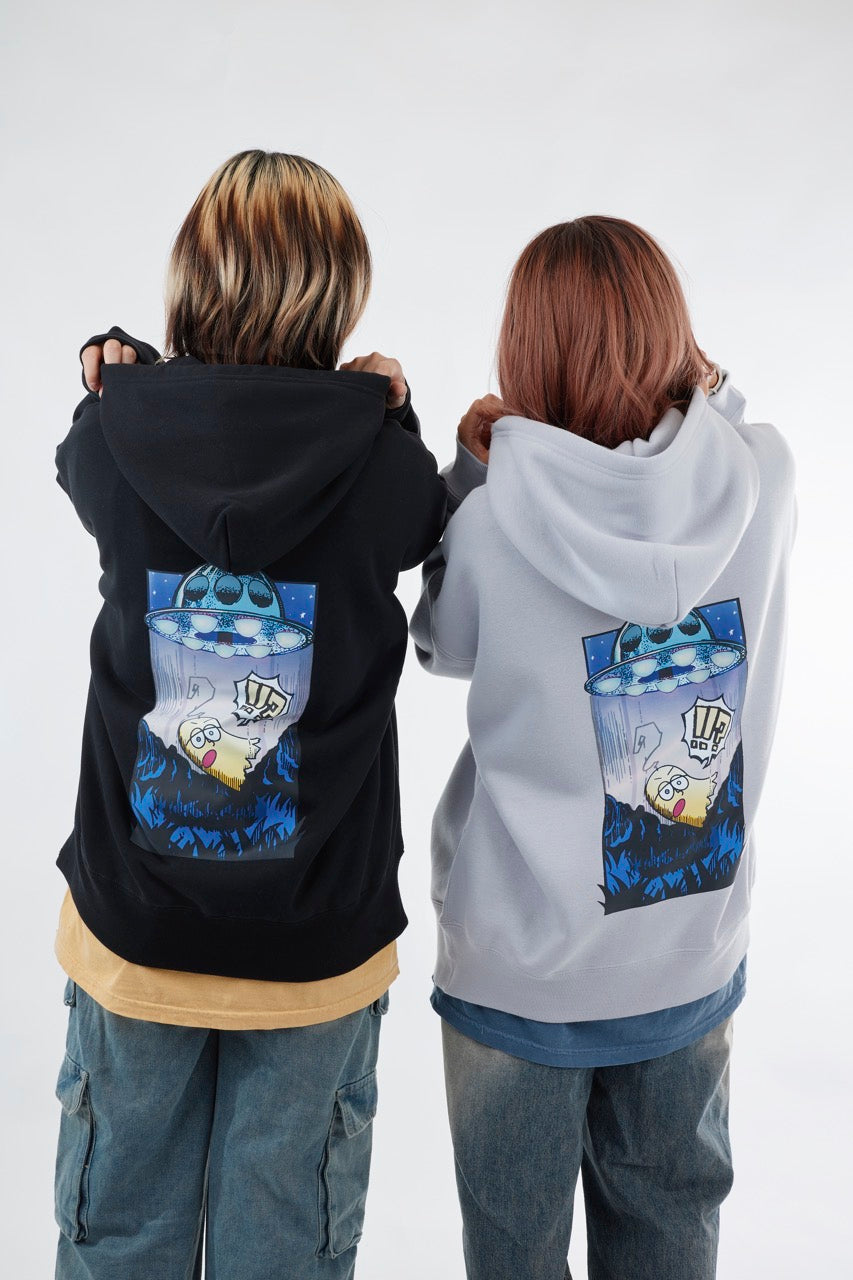 ん?!あれは、UFO!? 連れ去られてキャトルミューティレーションされちゃう〜👽🛸✨✨✨ 背中のプリントは、 カメラのフラッシュを焚いて撮影すると UFOの光線が光るスペシャル仕様⭐️ これを着ればキャトられずに 仲間だと思われるかもしれないです👍🏼 親指マンが、連れ去られちゃう〜!!