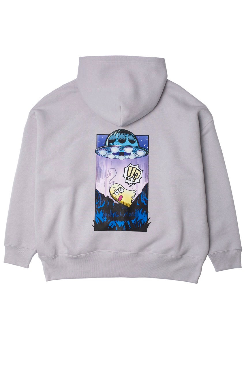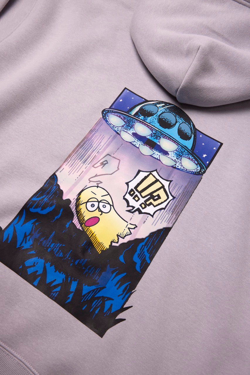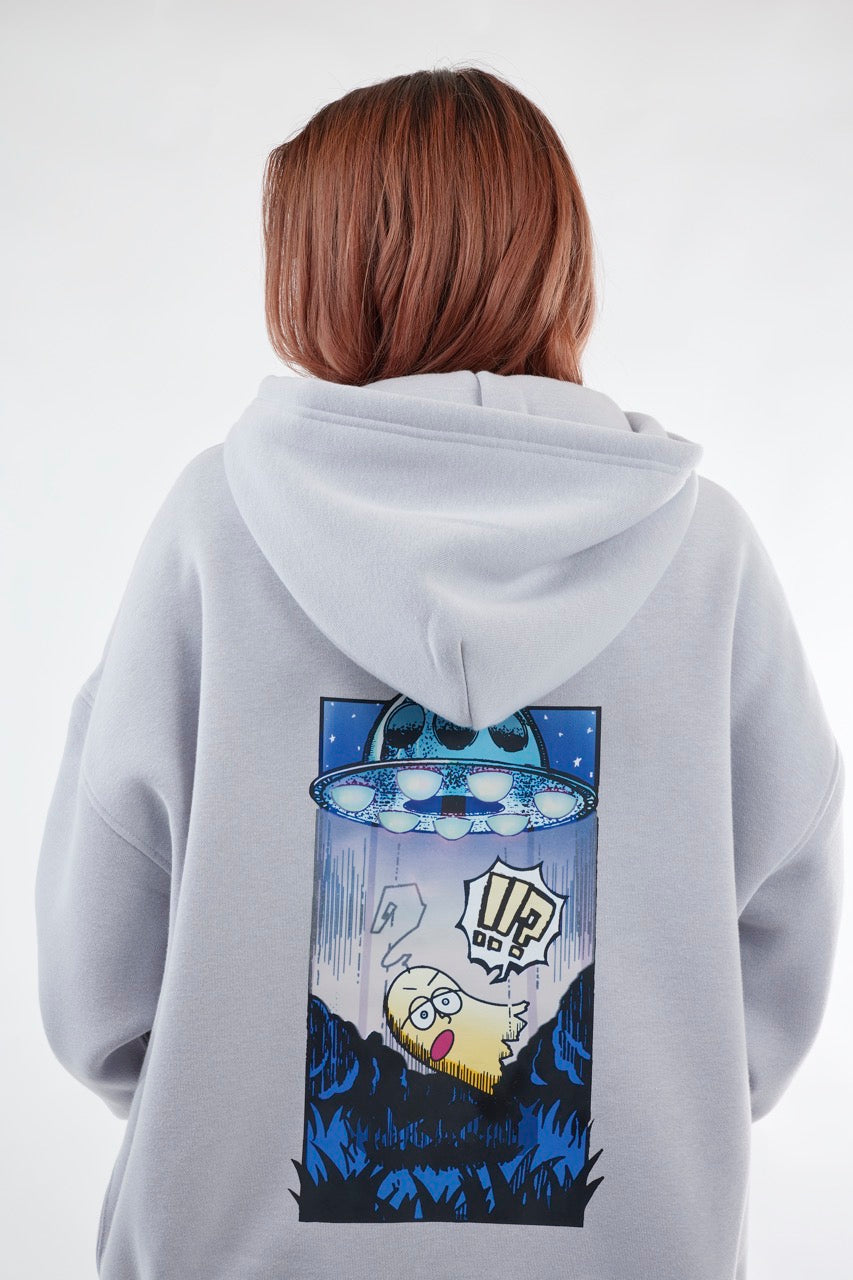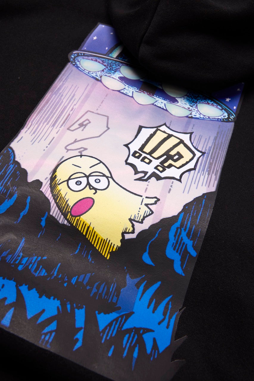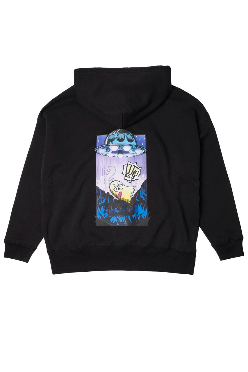 ん?!あれは、UFO!? 連れ去られてキャトルミューティレーションされちゃう〜👽🛸✨✨✨ 背中のプリントは、 カメラのフラッシュを焚いて撮影すると UFOの光線が光るスペシャル仕様⭐️ これを着ればキャトられずに 仲間だと思われるかもしれないです👍🏼 親指マンが、連れ去られちゃう〜!!