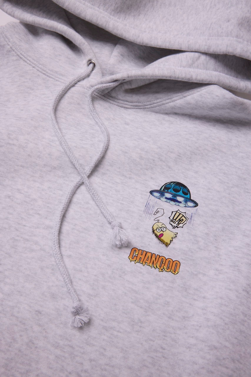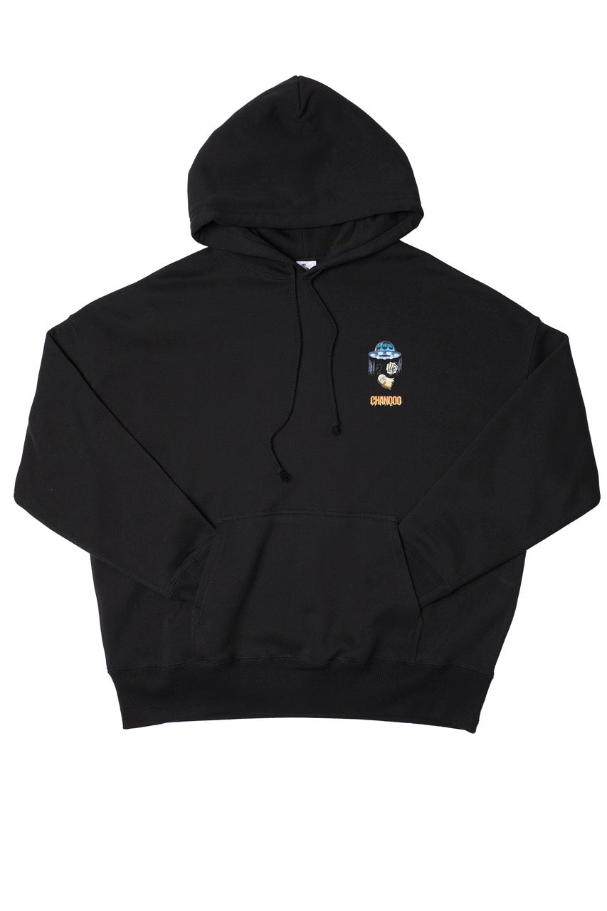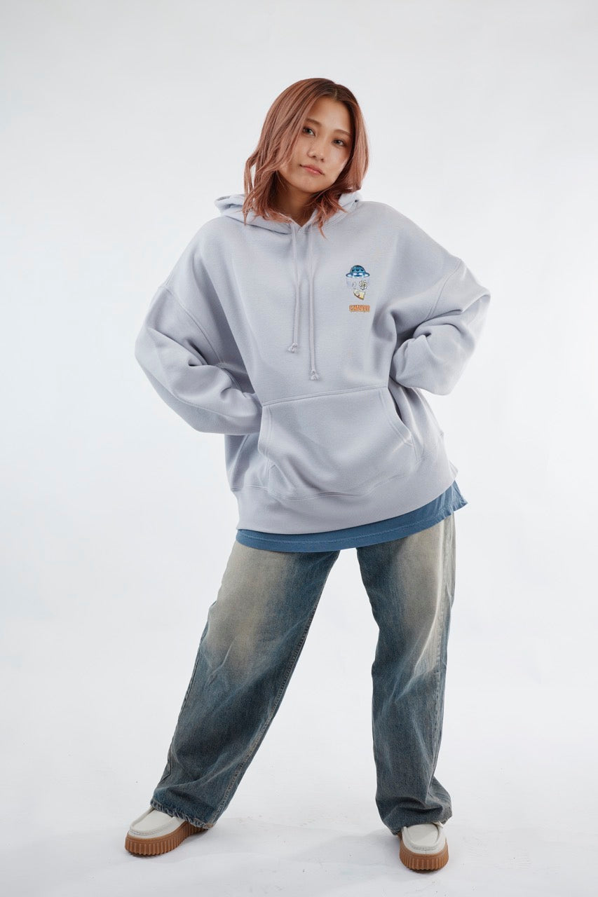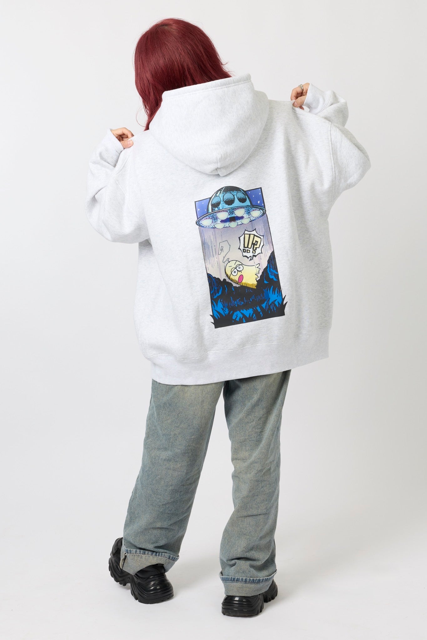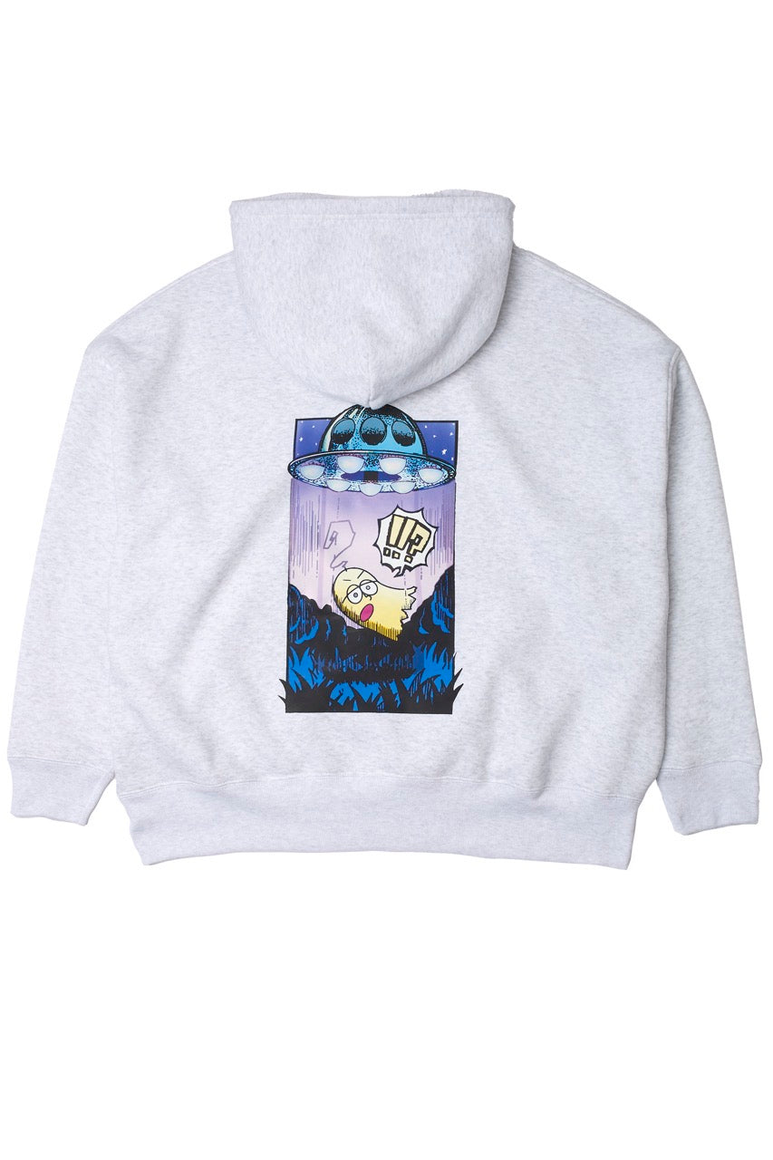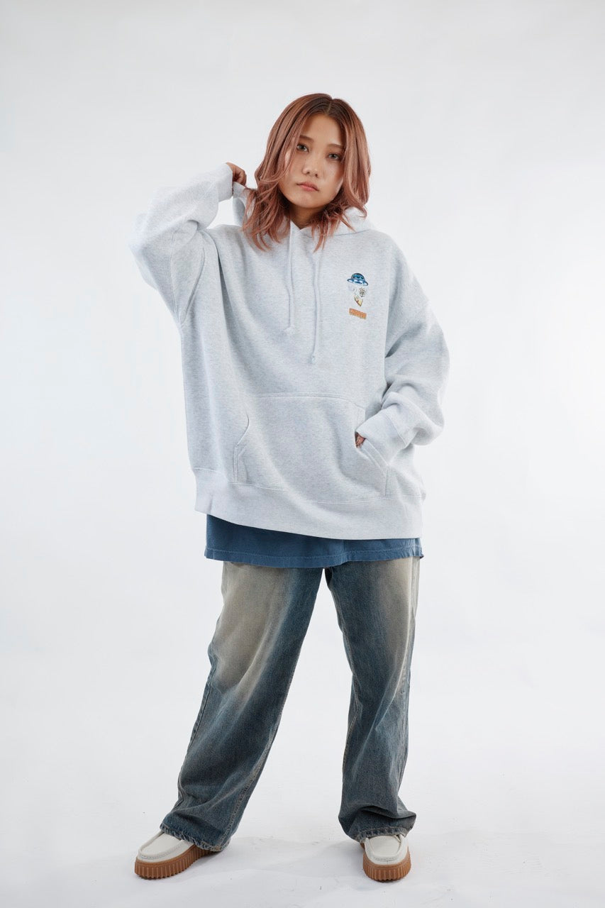 ん?!あれは、UFO!? 連れ去られてキャトルミューティレーションされちゃう〜👽🛸✨✨✨ 背中のプリントは、 カメラのフラッシュを焚いて撮影すると UFOの光線が光るスペシャル仕様⭐️ これを着ればキャトられずに 仲間だと思われるかもしれないです👍🏼 親指マンが、連れ去られちゃう〜!!