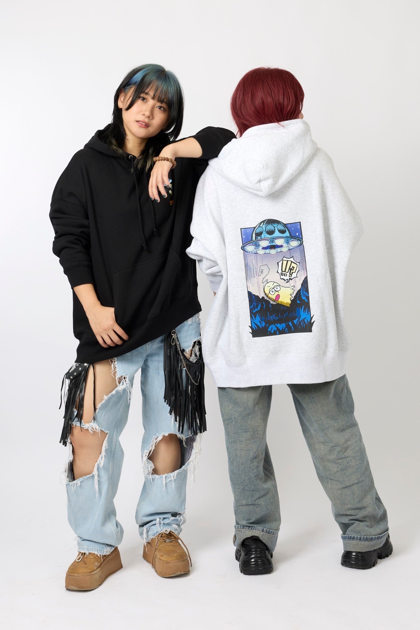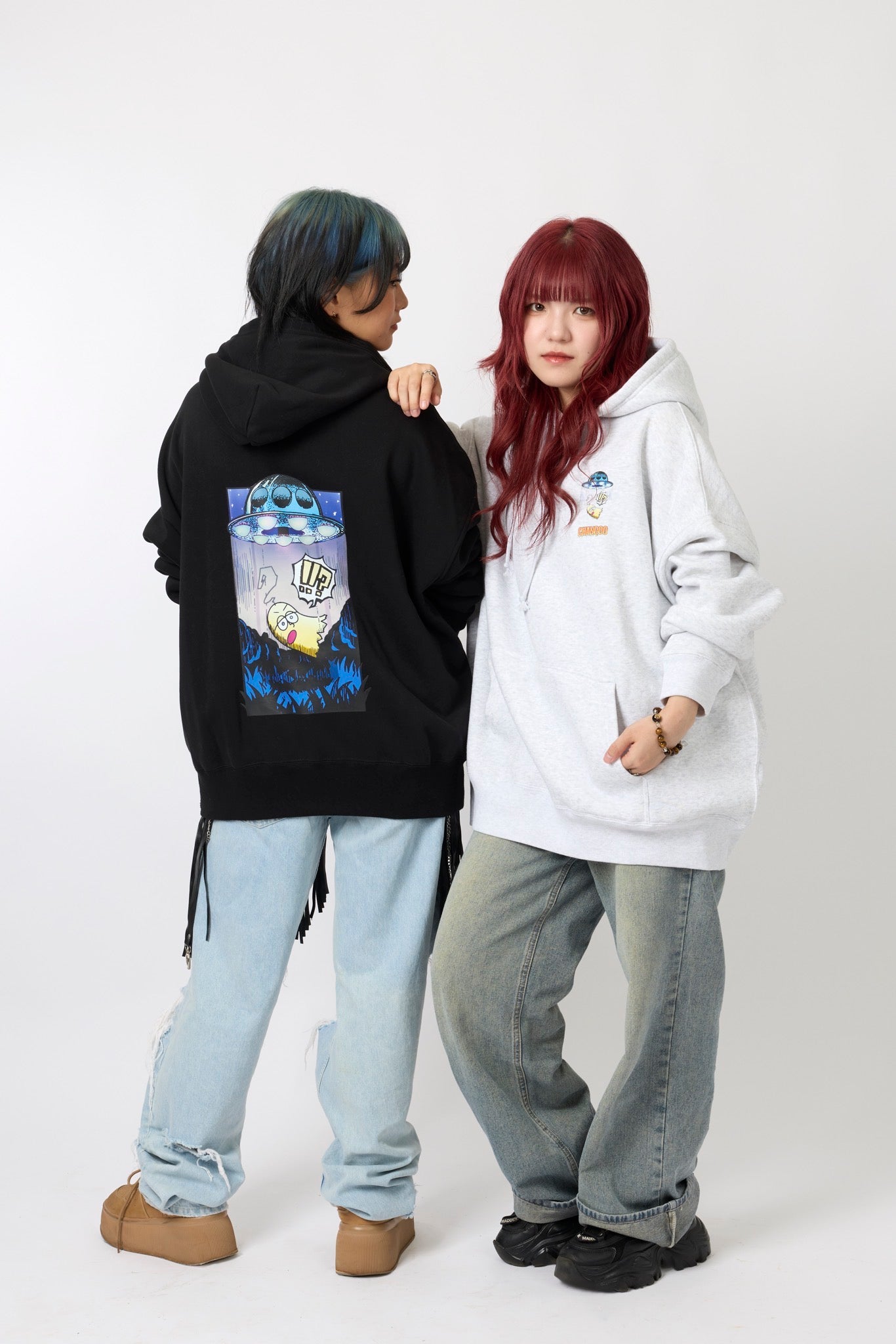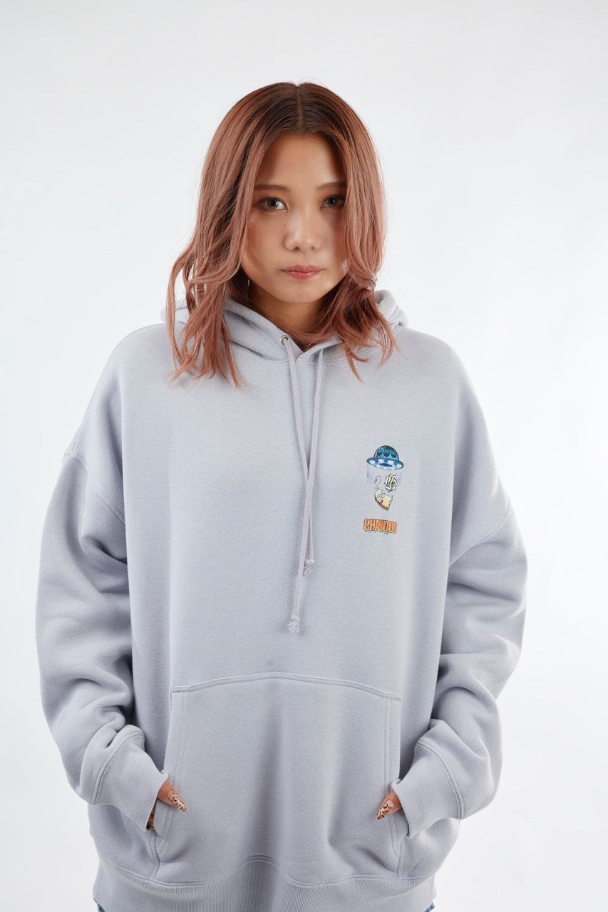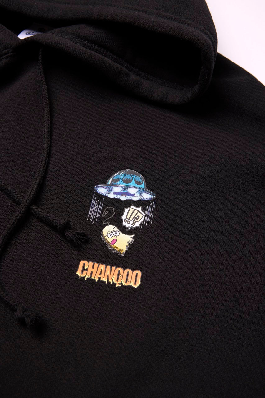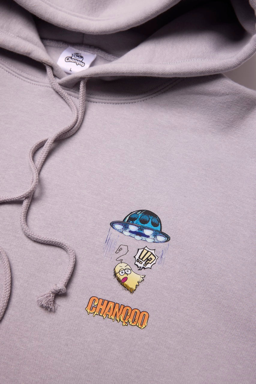 ん?!あれは、UFO!? 連れ去られてキャトルミューティレーションされちゃう〜👽🛸✨✨✨ 背中のプリントは、 カメラのフラッシュを焚いて撮影すると UFOの光線が光るスペシャル仕様⭐️ これを着ればキャトられずに 仲間だと思われるかもしれないです👍🏼 親指マンが、連れ去られちゃう〜!!